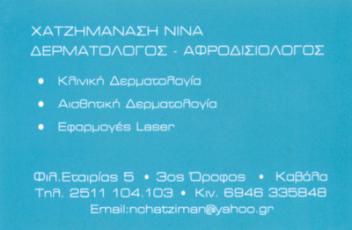 customer tabsΕπικοινωνίαΔέχεται καθημερινά 09:00 -13:00 & 18:00 -20:00εκτός Τετάρτης & Παρασκευής ΑπογεύματοςΔερματολόγοι - ΑφροδισιολόγοιΥγείαΦιλ. Εταιρείας 5, ΚαβάλαΚΑΒΑΛΑ ΚΑΒΑΛΑΣΚΑΒΑΛΑΜΑΚΕΔΟΝΙΑ 2511104103 6946335848nchatziman@yahoo.gr Το προτείνω (έχει προταθεί 0 φορές) ΦωτογραφίεςFacebook LikeShare on FacebookTweet Widget